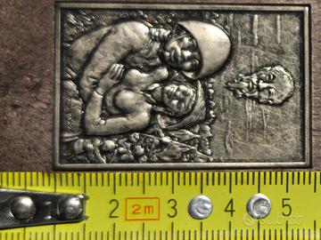 Miniatura in bassorilievo riprodotta e commercializzata dalla Senesi Acqua Srl di Milano su lamina in argento, inserita su supporto plastico ad imitazione del legno, fa parte del ciclo I quattro elementi. Opera: Pace nel Vietnam, 1977 di Giuseppe Migneco (1908-1997), pittore e incisore espressionista, fondatore del movimento Corrente.