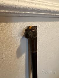 Si tratta di un bastone da passeggio in legno con un'impugnatura scolpita a forma di pugno.