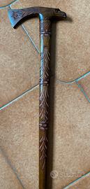Bastone da passeggio (presumo anni ‘60/‘70), riproduzione di un’antica ascia-bastone, in origine con la “testa” in metallo, utilizzata nei Paesi dell’Europa centrale orientale (in Polonia chiamata ciupaga). Lunghezza 90 cm. puntale in metallo.