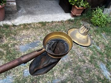 Vecchio bastone primi '900 che serviva nelle chiese per la raccolta di offerte materiale ottone, legno ,e pelle lunghezza cm 174 oggetto originale e introvabile