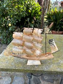Scultura decorativa di barca a vela in corno di bue, lavorata a mano, con aste metalliche e legature, risale alla seconda metà del ‘900.