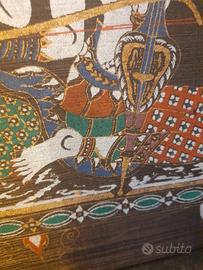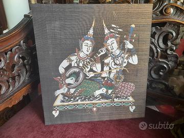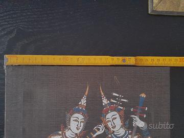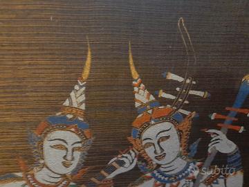 La tela di seta raffigura due musicisti Thep Fanom (angeli celesti) della tradizione Thai in abiti cerimoniali Le dimensioni sono di 30 cm in altezza per 28 cm in larghezza.. Si tratta di seta naturale montata su un telaio piatto in legno volendo è già pronta per essere appesa. Nelle notti di luna piena, sopra le foreste della Thailandia, i Thep e le Tevada (gli esseri celesti) discendono dai regni invisibili per portare armonia nel mondo degli uomini. Questi due angeli musicisti, seduti su una nuvola dorata, hanno il compito di accordare il cuore del mondo. Mentre uno pizzica le corde del liuto per scacciare i pensieri tristi, l'altro usa l'arco del suo violino per tessere un tappeto di serenità sopra le case. Si dice che chi possiede la loro immagine non ascolterà mai il silenzio della solitudine, perché la loro musica invisibile protegge la gioia della casa e attira la benevolenza degli dei superiori. Saw Sam Sai il violino a tre corde. La figura a destra tiene un liuto ad arco con un corpo a forma di guscio di cocco. È considerato lo strumento più elegante e difficile della musica classica tailandese Krajappi la figura a sinistra suona un antico liuto a quattro corde con una cassa ovale. È lo strumento "antenato" della musica classica thailandese, usato per accompagnare i racconti e le danze celesti. Insieme, i due strumenti creano la "musica totale", quella che mette in comunicazione gli uomini con gli dei. Lo stile è etnico vintage risalente agli anni 80 ed è perfetto per un arredamento Boho-Chic, esotico o per arricchire una collezione di arte asiatica. Le condizioni vintage sono ottime con colori ancora molto vividi e la trama della seta perfettamente integra. Spedizione accurata e veloce SCONSIGLIO Poste italiane sono lente e inaffidabili