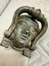 Battente per porta o portoni antico in ferro e ghisa, raffigurante un volto mitologico,una sfinge. Caratteristiche Principali: Materiale e Finitura: È realizzato in metallo pesante, Ferro e ghisa con una finitura patinata che gli conferisce l’aspetto invecchiato e rustico del quale è, oggetto SECOLARE fine 800 !!! Design: Presenta una placca superiore a volto di Sfinge e un anello sottostante che funge da battente, il quale colpisce un pomello circolare decorativo separato (chiamato anche "battaglio" o "controbattente"). Stile: Questo battente è tipico dello stile nostalgico antico,con richiami a figure mitologiche egizie, oggetto che viene molto usato per decorare portoni o porte d'ingresso in ville, casali,palazzi d’epoca,o case private d'epoca. Questo è un oggetto di grande valore, artistico storico. Le misure le vedete in foto, il peso totale dei 2-pezzi è di 2000grammi ( 2-Kg. ) di peso e di spessore. Classico battente ( ANTICO ) Tedesco a testa di faraone del XIX secolo, realizzato in Ferro/Ghisa. Una bella aggiunta alla tua porta o portone d'ingresso. Trovato in una vendita immobiliare ( Antiquaria ) in Germania. XIX secolo (diciannovesimo secolo), noto anche come Ottocento o '800, è il periodo storico compreso tra il 1° gennaio 1801 e il 31 dicembre 1900 inclusi. L’oggetto viene venduto come da foto e descrizione; senza aver messo mano nella pulitura o quant’altro,viene venduto con tutto il fascino degli anni che ha. A voi resta la pulitura, o altro. Il prezzo è di euro 199,00 e rimane questo per chi compra, non soggetto a sconto. Attenetevi a mandare solo offerta di acquisto ( no a prezzo diverso ).