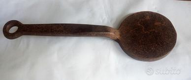 Batticarne francese rotondo antico Batticarne con paletta rotonda e piatta, ottenuto con acciaio fuso di origine francese (marchiato sul manico “acier fondu”), dotato di manico lungo e forato in testa per poterlo appendere quando non è in uso. Lo stato è ottimo. Le dimensioni sono: Lunghezza 29 cm – Larghezza 9 cm. – Spessore paletta mm.100 Dal Web – Biblioteca Culinaria Usato come un martello o un mazzuolo, questo tipo di batticarne è più recente di quello con la forma a paletta. Sembra una via di mezzo nell’evoluzione verso lo strumento che conosciamo oggi a forma di fungo rovesciato. La sua funzione era quella di rompere e stritolare le fibre più dure della carne e appiattire e allargare la fetta.