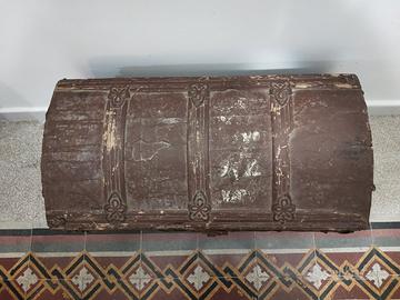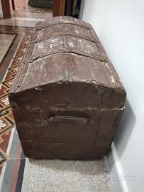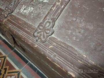 Antico Baule in legno e rivestito in ferro lavorato e ricoperto in cuoio, con decorazioni ornamentali laterali e frontali, una maniglia laterale in cuoio