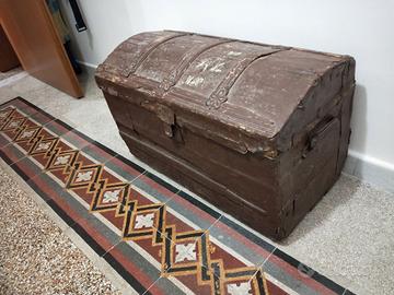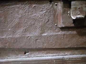 Antico baule in legno lavorato in ferro e rivestito in cuoio, con decorazioni ornamentali sia frontali che laterali, un manico laterale