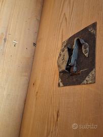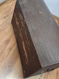 Materiali: Legno massello di conifera (probabilmente abete o pino), ferramenta in ferro battuto o forgiato (maniglie laterali e serratura a scrocco interna).
