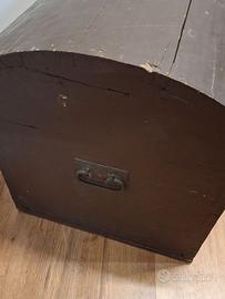 Curiosità / Note storiche: Le cassapanche con coperchio arrotondato, note anche come bauli da viaggio o "bauli a semicilindro", erano molto usate nel periodo post-unitario (fine '800/inizio '900). Questa tipologia era robusta e la forma arrotondata aiutava a far scivolare via l'acqua in caso di trasporto all'aperto o in ambienti umidi.