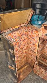 foderato con stoffa floreale (tipica degli anni ’30-’40), dotato di cassetti, aste per appendere abiti e scomparti per oggetti personali.