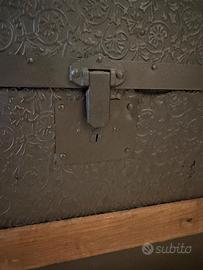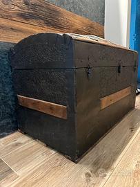 Baule di forma rettangolare con coperchio bombato. Realizzato in legno e metallo, con finiture rustiche. La struttura principale è in legno verniciato di nero opaco, arricchita da fasce orizzontali in legno naturale sui lati e sul coperchio. Il coperchio è suddiviso in pannelli arcuati decorati con rilievi in metallo scuro, fissati da listelli in legno e angolari ornamentali in ferro lavorato. Presenta tre chiusure frontali in metallo: una centrale più grande, probabilmente predisposta per un lucchetto, e due laterali più piccole. Lo stile è vintage, con un aspetto robusto e artigianale.