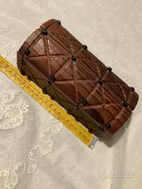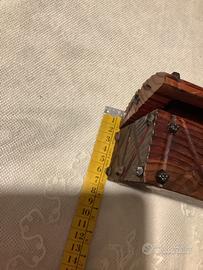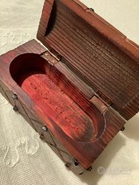 Cofanetto vintage in legno fatto a mano a forma di bauletto con lavorazione a intaglio e borchie in metallo (ne mancano due , una per lato ) . Il coperchio è ricurvo.