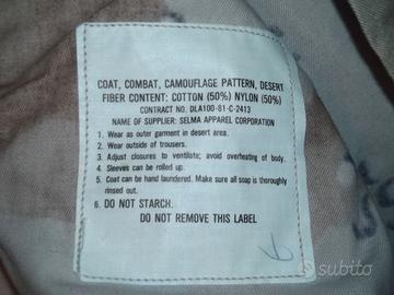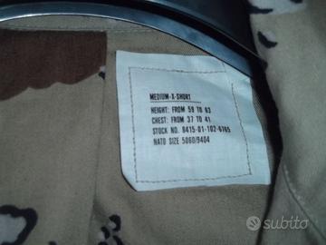 NON ACCETTO PAGAMENTI TRAMITE SUBITO. Se interessati, contattatemi Giacca da combattimento Us Army mimetismo Desert 6 Colori. Appare nuova di magazzino e delle prime prodotte. Contract Date 1981. Tg Medium-Extra Short. Presenta una macchia di circa 2 cm di lunghezza in basso, sul davanti, come da foto. Misure : spalle cm 47, ascelle 59, lunghezza 71, manica 57. Spedizione € 10.80 Poste Delivery Standard