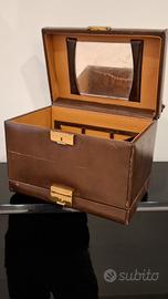 Vendo beauty case vintage originale, struttura rigida rivestita in pelle marrone con chiusure in metallo dorato e manico superiore coordinato.