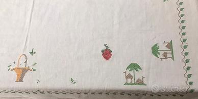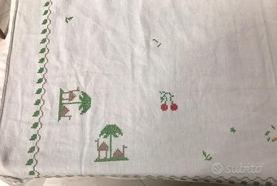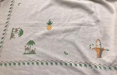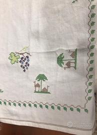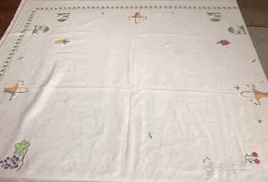 Bella Tovaglia vintage quadrata tutta ricamata a mano Anni ‘40. Dim. cm. 120 X 120 con cestini, ambienti e frutta assortita, cammelli ed alberelli.