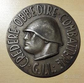 Distintivo della gioventù italiana del LITTORIO credere obbedire combattere, realizzata nel 1938 senza data. Veniva spesso usato come ferma fazzoletto da collo dai giovani inquadrati nelle associazioni giovanili del partito Fascista italiano.