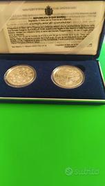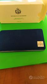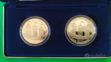 REPUBBLICA di SAN MARINO - Cofanetto originale, con certificato di garanzia, emesso dalla Zecca di Stato di due monete argento, una da 5 Euro e l'altra da 10 Euro, in versione a Fondo Specchio, dedicate a "Benvenuto Euro" emesse dalla Repubblica di San Marino nell'anno 2002.