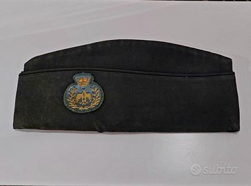 Autentico berretto a bustina (bustina d'ordinanza) in dotazione al personale dell'Aeronautica Militare Italiana. Questo copricapo, realizzato in robusto panno di lana blu scuro, rappresenta un pezzo fondamentale dell'uniforme storica e operativa, perfetto per collezionisti di uniformologia o per esposizione.