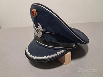 Berretto originale d ordinanza da Sottufficiale della "Luftwaffe" Areonautica Tedesca. Post 1955. Prodotto dalla Alkero (Albert kempf K.G.). Fregio argentato con ali e coccarda tipica militare tedesca rosso nera su sfondo dorato. In ottime condizioni taglia 54