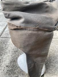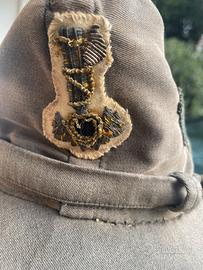 Raro Berretto grigio verde in tela , scolorito dal tempo , con aggiunto il paraorecchie . Lo si nota perchè di altra tonalita , ma selpre verde .raro fregio dei fascisti universitari