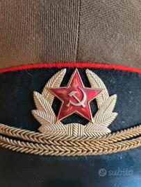 Berretto da ufficiale dell'esercito sovietico (фуражка), produzione originale 1990. Fabbrica НПШО "Юность", Borovichi (Russia), taglia 60. Calotta in tessuto militare con bordino a vivo, fascia in panno nero, visiera in materiale rigido nero. Doppio cordoncino intrecciato con nodo laterale e bottoni a stella. Fregio frontale con stella rossa smaltata, falce e martello, su corona d'alloro. 📍 Condizioni: ottime per l'età, conservazione eccellente. Tutti gli elementi originali presenti e integri. Interno con fodera in tessuto beige originale. 🔴📋 La фуражка è il copricapo ufficiale dell'esercito russo e sovietico, rimasta pressoché invariata dal periodo zarista fino alla dissoluzione dell'URSS nel 1991. Questo esemplare, prodotto nel 1990, è uno degli ultimi fabbricati sotto il regime sovietico, rendendolo un pezzo di storia a tutti gli effetti.