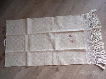 In particolare il primo nella foto è contraddistinto da una trama "a scacchi" dove risaltano le iniziali e il prezioso pizzo color panna lavorato all'uncinetto, con frange che abbelliscono uno dei due lati.