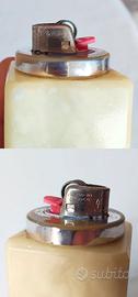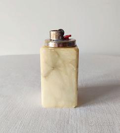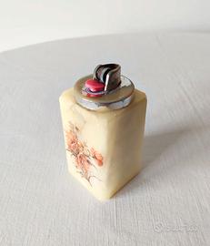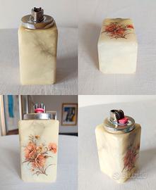 Splendido accendino da tavolo vintage anni '70/'80, realizzato in alabastro e caratterizzato da una decorazione floreale in stile retrò Corpo dell'accendino con meccanismo BIC, con loghi e dicitura Made in France Altezza 9 cm, larghezza 4 cm La ghiera metallica presenta segni di usura nella cromatura Un oggetto di design che era usato per impreziosire studi e salotti, dunque perfetto per collezionisti di oggettistica vintage o per chi desidera un dettaglio ricercato per la propria scrivania