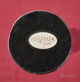 La base è circolare e presenta incisioni decorative in stile antico o celtico, con una finitura argentata ed effetto invecchiato.