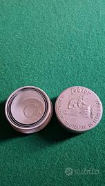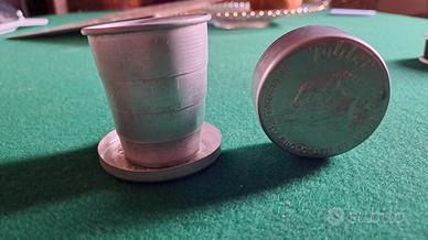 Bicchiere telescopico vintage in alluminio, pubblicitario del marchio storico di cioccolato svizzero Tobler . Il marchio è stato creato da Theodor Tobler e suo cugino in Svizzera nel 1908. Il bicchiere è progettato per collassare su se stesso, diventando piatto per un facile trasporto. Venivano utilizzati in passato per bere acqua o amari durante i viaggi o le escursioni. Dimensioni: Altezza 6 cm Diametro 5 cm Chiuso 2 cm. Oggetto come da foto