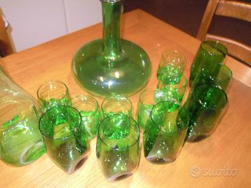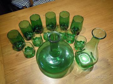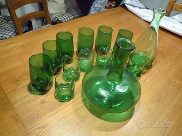 12 bicchieri 6 da vino 6 per acqua, bottiglia per acqua e decanter vino il tutto in vetro soffiato di Empoli anni 1930/40 all'interno del vetro si notano le bollicine d'aria della lavorazione artigianale praticamente set completo per fare la differenza su qualsiasi tavola apparecchiata tutto in perfette splendide condizioni .