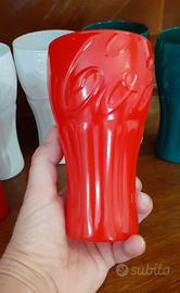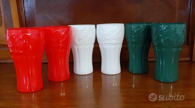 N°6 Bicchieri pubblicitari della Coca Cola anni'80. realizzati in vetro colorato verde, bianco e rosso in omaggio alla bandiera italiana .Altezza bicchieri 14cm, normali e accettabili segni dell'età.