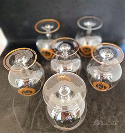 Vendo sei bicchieri da Cognac anni '50, la doratura è parzialmente rovinata in particolare modo su un bicchiere, vedi foto, altezza cm 10 e diametro cm 5.