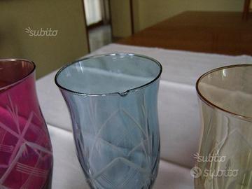Sei bicchieri a calice vintage, di 6 diversi colori, dalla forma elegante. Uno leggermente sbeccato, a 25,00.
