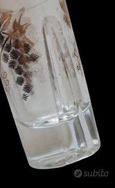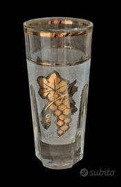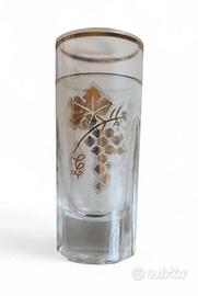 Bicchiere da liquore / Shot glass Vetreria da tavola "Mid-Century Modern". Periodo stimato: Metà del XX secolo (ca. 1950–1970) Il corpo vitreo presenta una configurazione ibrida: Base (Piede): A sezione esagonale con fessurazioni radiali incavate ("pinched base") Corpo: Cilindrico, rastremato verso il basso in corrispondenza delle sfaccettature della base. Bocca: Circolare con orlo rifinito a caldo e filettatura in oro zecchino La decorazione è realizzata con tecnica a serigrafia smaltata e doratura a terzo fuoco: Fregio Principale: Rappresentazione naturalistica di un grappolo d'uva con foglia di vite pampinata. Il decoro è reso con una retinatura fine (punto sodo) che conferisce texture e profondità. Sfondo: Fascia centrale satinata a "effetto ghiaccio" o "acidata" che avvolge il corpo del bicchiere, fungendo da base cromatica per il motivo dorato. Finiture: Doppia filettatura in oro sulla sommità (orlo e bordo superiore della fascia satinata). tipico esempio di vetro da bar domestico del boom economico. Il motivo dell'uva è un classico dell'iconografia legata ai distillati (grappe o brandy). La combinazione tra la base geometrica "brutalista" e la decorazione figurativa dorata lo colloca nel gusto eclettico degli anni '60, dove la produzione industriale cercava di emulare la raffinatezza della cristalleria artigianale 6 bicchieri peso cadauno 116gr altezza 9,5cm diametro bocca 4cm