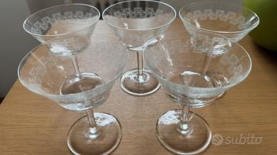 Calici vintage a coppa: Decorati con motivi geometrici incisi, ideali per servire cocktail, liquori o champagne. Stile vintage, perfetti per l’uso quotidiano o per esposizione.