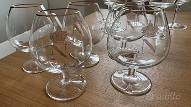 Bicchieri da cognac Baccarat Napoleon: Modello a palloncino con iniziale "N" dorata coronata e bordo in oro 24k. Prodotti dalla rinomata cristalleria francese Baccarat, sono ideali per la degustazione di cognac o brandy.