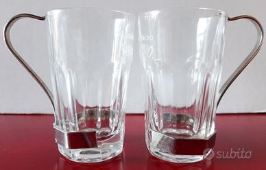 Coppia di bicchieri per liquori, con scritta bianca del marchio San Pellegrino (Sanpellegrino S. Pellegrino). Manico in metallo smontabile. Oggetti nati come gadget pubblicitari.