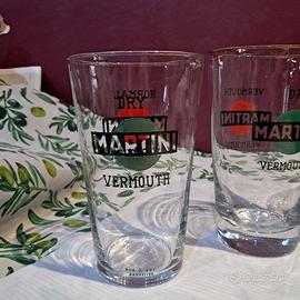 2 bicchieri Martini Dry Vermouth con logo storico, beccuccio, e bordo dorato.
