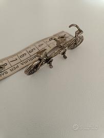 Miniatura in argento punzonato 800 di bicicletta tandem. Tenuta sempre in vetrinetta. Non presenta imperfezioni. Le piccole ruote girano liberamente. Fattura molto particolare degli anni '80/90. Vintage da collezione. Lunghezza 6 cm. circa. Altezza 3 cm. circa.