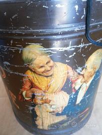 Bidone in latta Talmone "Due Vecchi" originale anni '20-'30. In condizioni discrete tranne un po' di graffi. Raro perché fornito non al pubblico ma solo alle sale da te o pasticcerie. 450€. Costi di spedizione da concordare. Si preferisce Vendita su Catania.