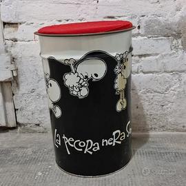 Vendiamo fustino/bidone in latta, vintage, con la duplice funzione di porta oggetti/giochi/ombrelli e sgabello/pouf/seduta completo di coperchio e cuscino rosso.