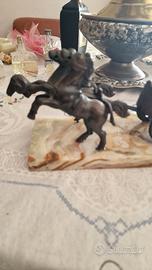 Statua, scultura in bronzo con base in pietra. Due cavalli rampanti che trainano una biga da guerra con il suo auriga (chi guidava la biga). La scena evoca l'epoca Impero Romano. Vintage