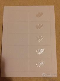30 bigliettini per sacchettini bomboniere (6 fogli 11 cm x 14 cm con 5 bigliettini per foglio) Carta ruvida buona qualità Stampa a cuoricino Mai utilizzati Zona ritiro Pescantina (VR) oppure spedizione a carico dell'acquirente