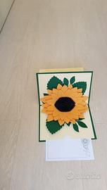 Biglietto a tema girasole, in cartoncino spesso, con inserto per messaggi e fustella sul fronte.