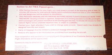 BIGLIETTO AEREO TWA NEW YORK ROMA NO SMOKING USATO VINTAGE