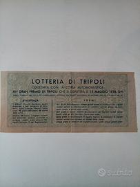 biglietto della Lotteria di Tripolidel valore di dodici lire, emesso nel 1938. Questi biglietti erano collegati all'annuale Gran Premio di Tripoli, una rinomata corsa automobilistica tenutasi sul circuito del Lago Mellaha in Libia, all'epoca colonia italiana.