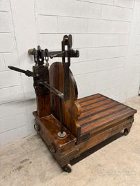 Bilancia a bascula per animali d’epoca, risalente probabilmente alla fine del XIX - inizio XX secolo. Struttura in legno massello e ferro battuto, con meccanismo a leva e contrappesi, barra graduata per la misurazione e ganci per i pesi. Dotata di ruote per un facile spostamento, era utilizzata per pesare bestiame come pecore e maiali.