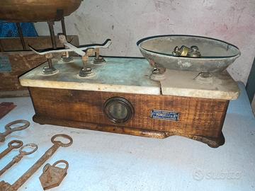 Bilancia piccola vintage base in legno con copertura in maro ( rotto e un piatto mancante ) comprende piccoli pesi da 200gr