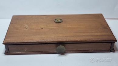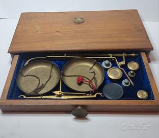 Bilancia a due piatti in ottone, su base in legno con cassetto rivestito in velluto, completa di pesi originali. Incisioni presenti: braccio sinistro: “to weigh” braccio destro: “100 g” al centro: “Made in India” dimensioni:29x15x4 Cm circa Oggetto affascinante in stile vintage/coloniale, con patina originale, ideale per collezionisti o come elemento d’arredo per farmacia, gioielleria o studio. Condizioni buone e coerenti con l’età. Venduta come oggetto decorativo/da collezione (è comunque funzionante). profilo inferiore destro legno inciso ma integro