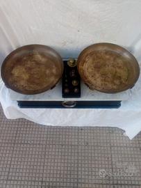 Bilancia meccanica da tavolo in legno, marmo e ottone con 11 pesi. Misure: circa 58 cm x 25 cm x 25 cm