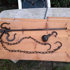 Bilancia a stadera con due catene munite di ganci per la pesa dei sacchi completa del proprio marco in ottone. L'asta misura 90 cm. con due scale: una pesa fino a 40 kg. e l'altra da 40 a 120 kg.